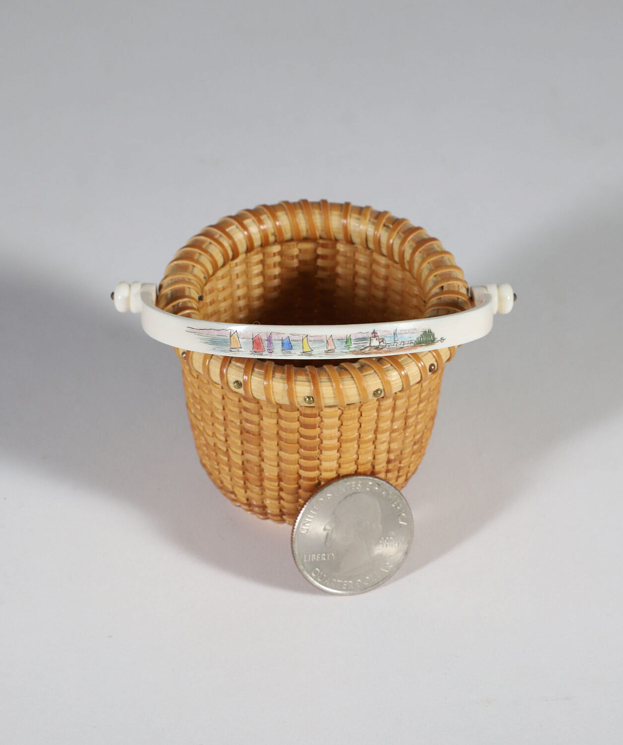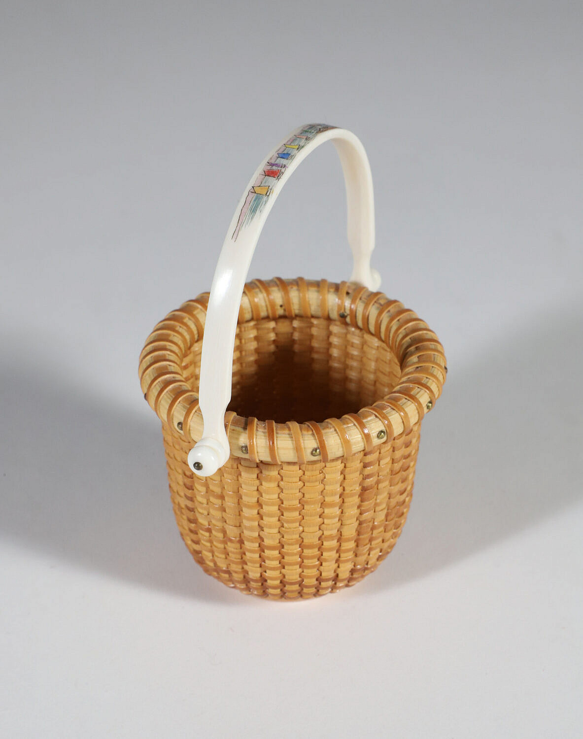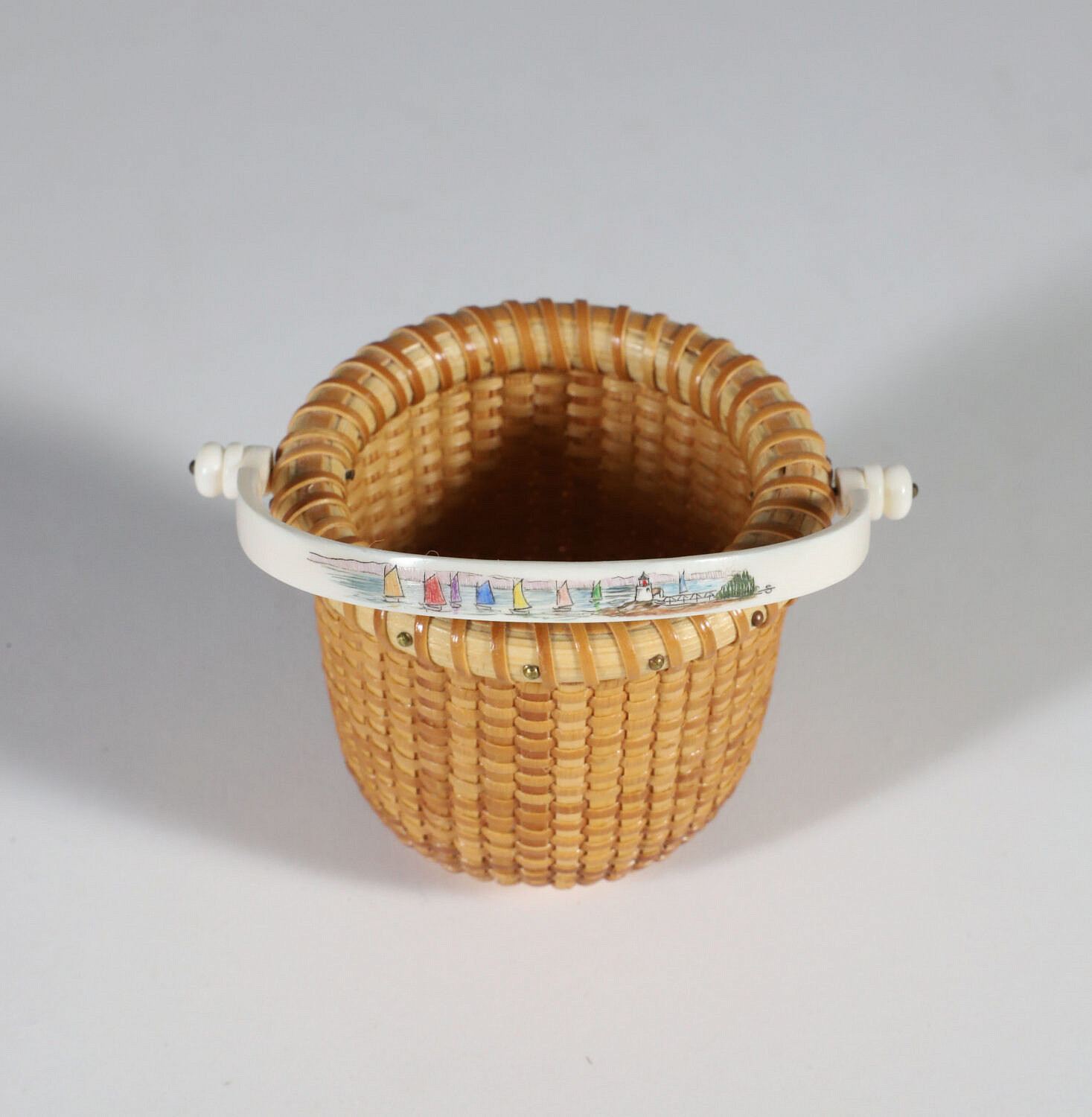 Jean M. Valerio Woven Miniature Open Swing Handle Basket, circa 2007, scrimshaw rainbow fleet handle, cherrywood base engraved, J.V. 2007