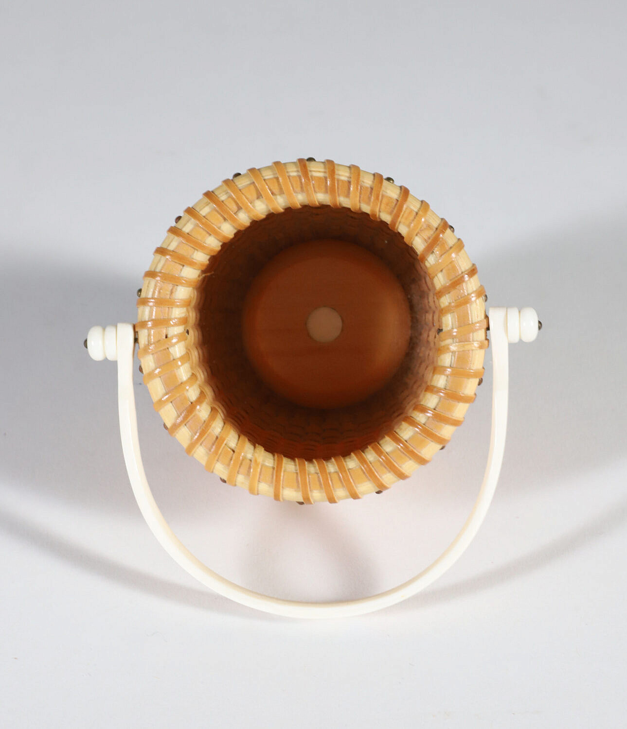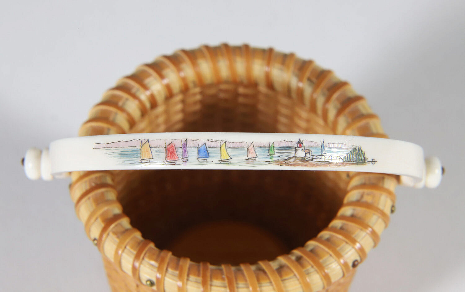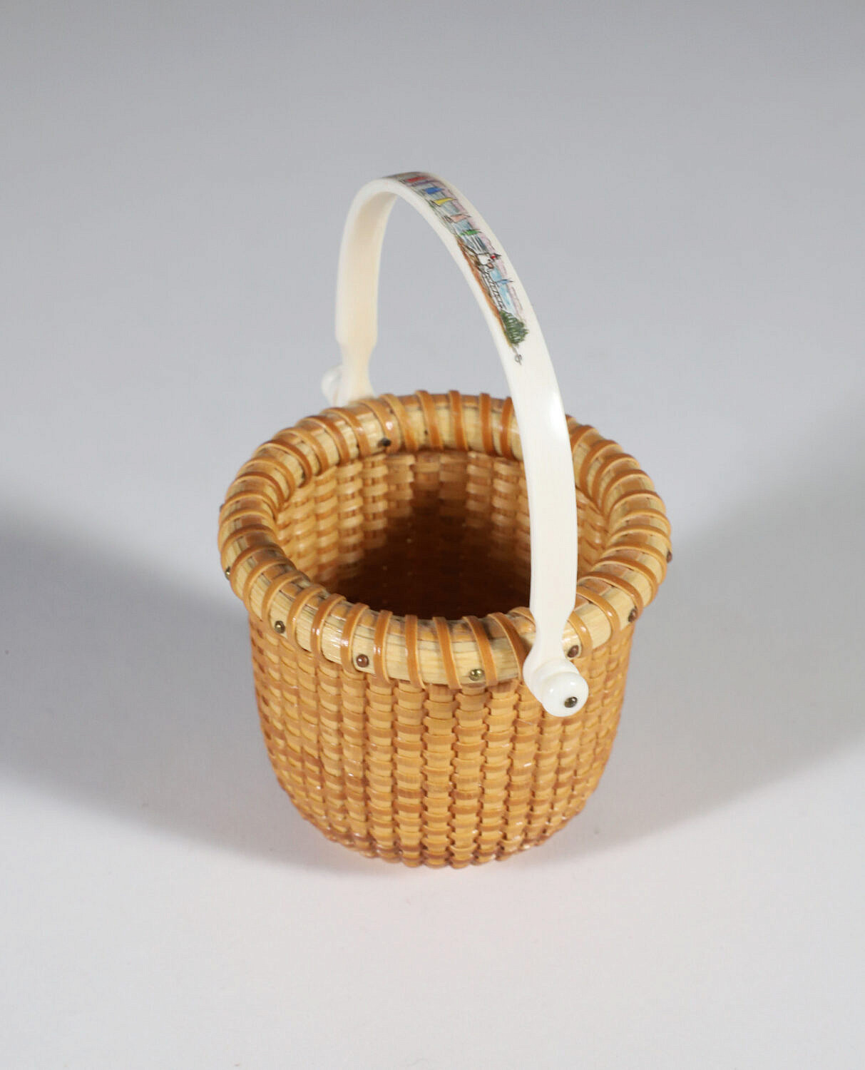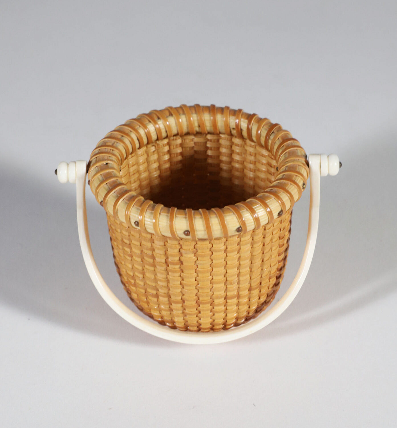 Jean M. Valerio Woven Miniature Open Swing Handle Basket, circa 2007, scrimshaw rainbow fleet handle, cherrywood base engraved, J.V. 2007