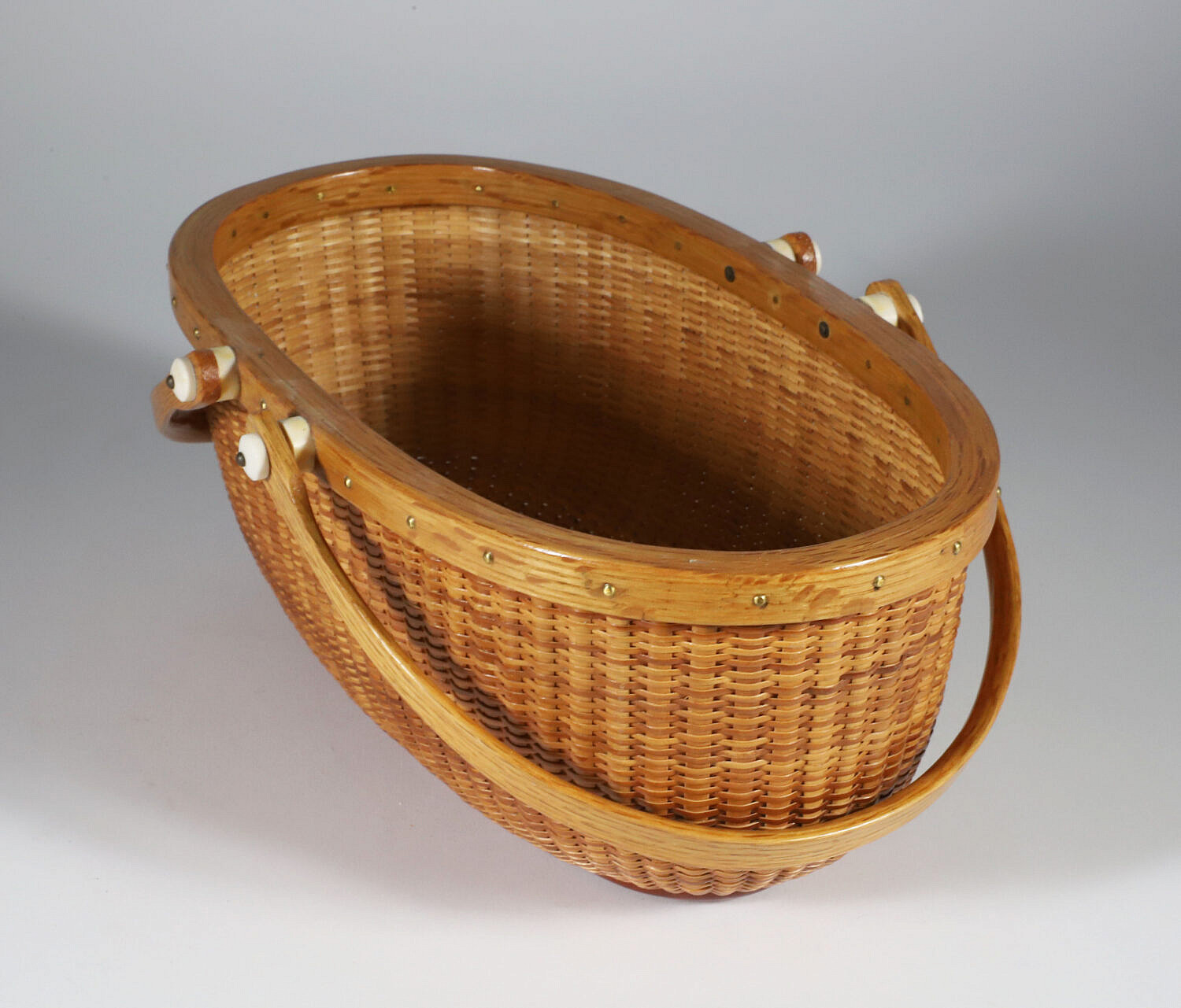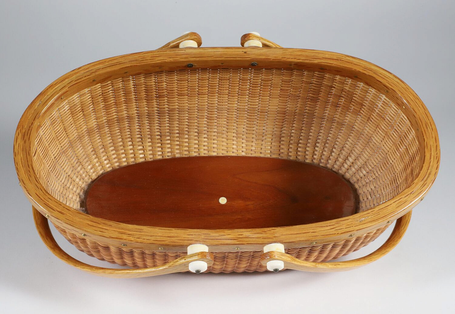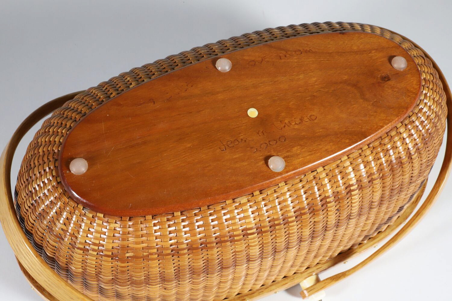 Jean M. Valerio Woven Oval Double Swing Handle Nantucket Basket, circa 2000, base inscribed: To Elise, Love Mom, Jean M. Valerio 2000