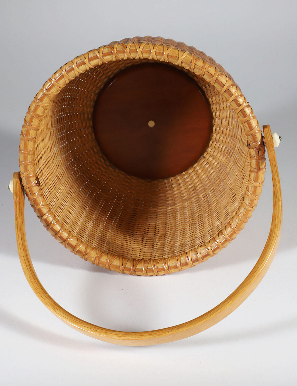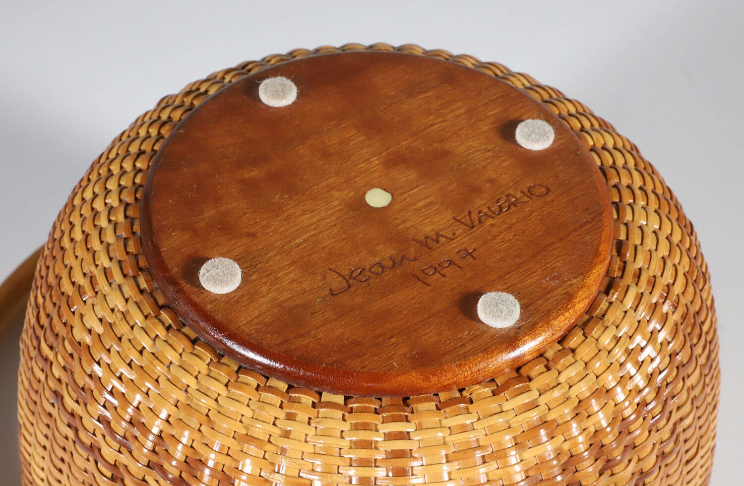 Jean M. Valerio Woven Round Open Swing Handle Nantucket Basket, circa 1997, cherrywood base, engraved Jean M. Valerio 1997