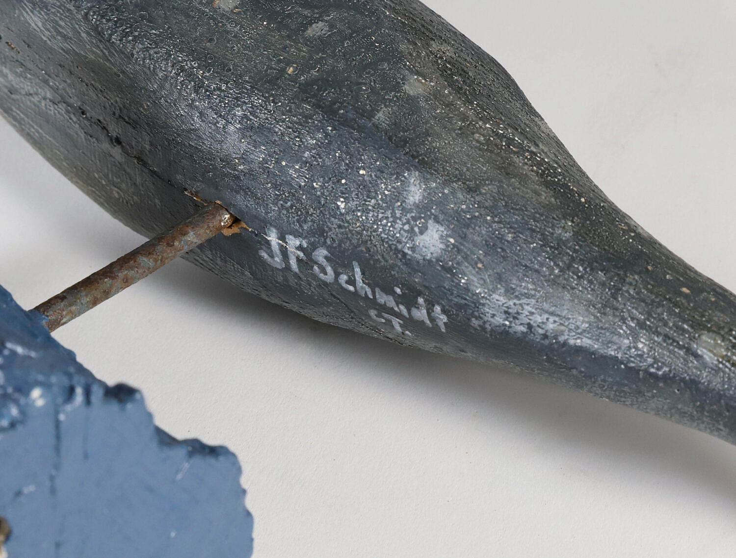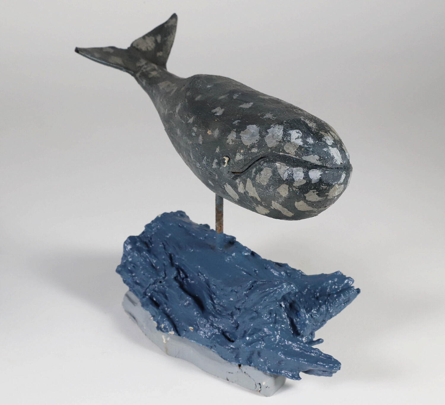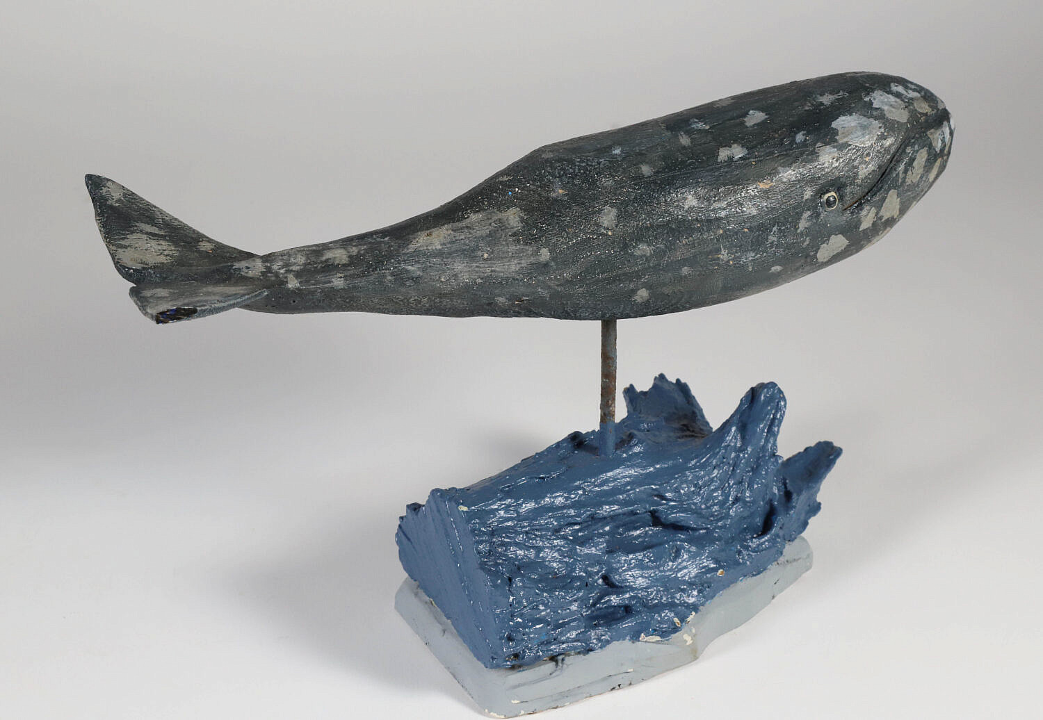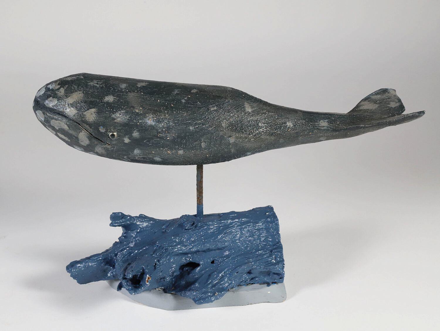 John Schmidt Folk Art Carved Gray Whale on Stand, signed on underbelly of whale and on underneath of stand