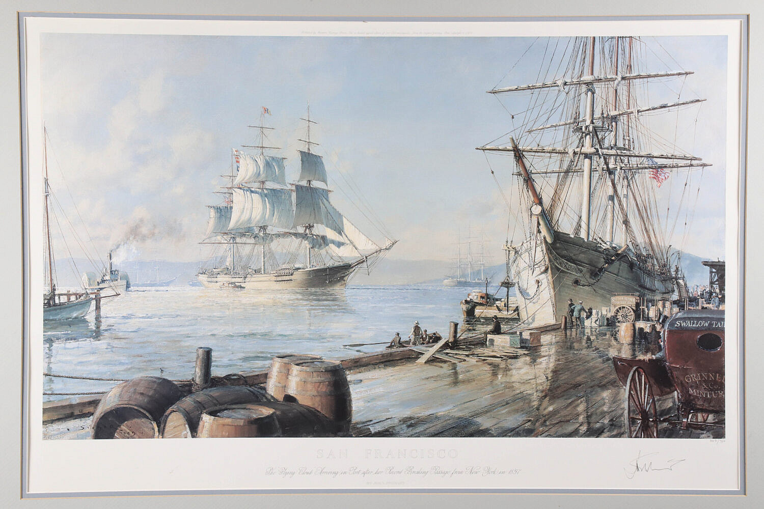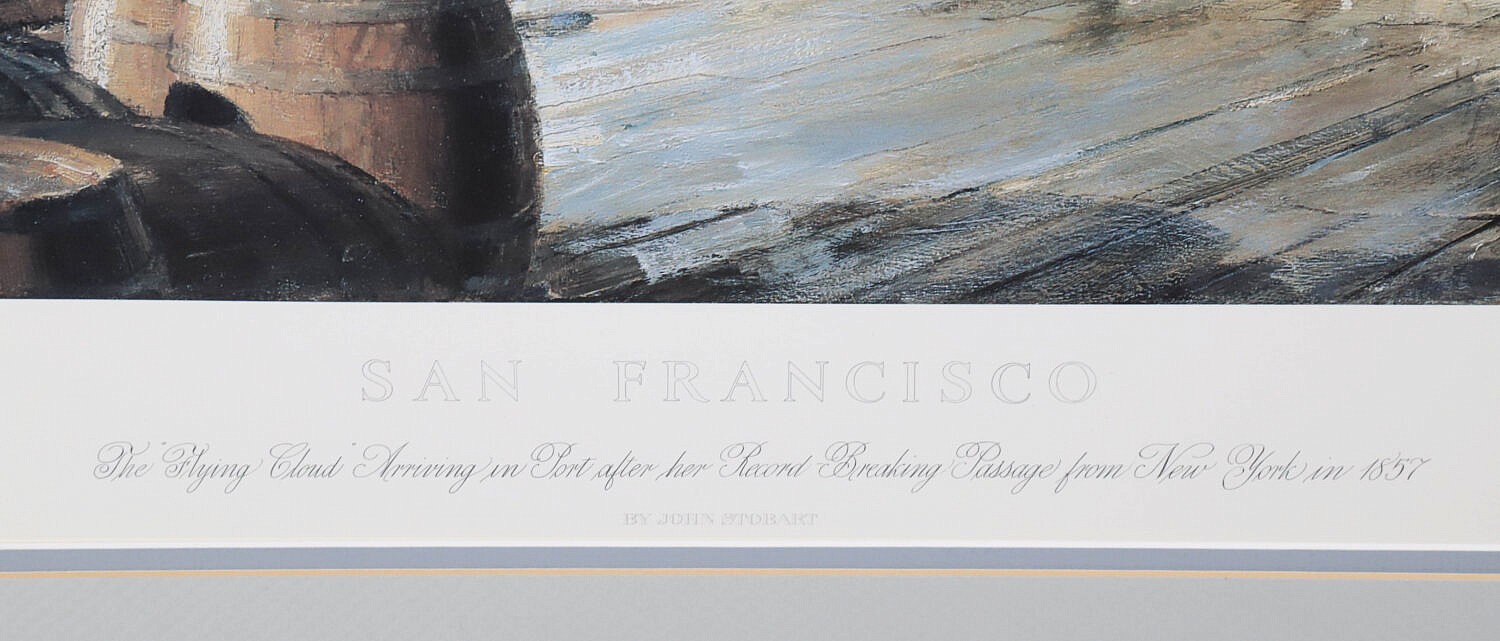 John Stobart (British 1929-2023) Limited Edition Colored Lithograph “San Francisco”, pencil signed lower right, edition #449/750, matted and framed. The flying Cloud Arriving in Port After Her Record Breaking Passage from New York, 1857.