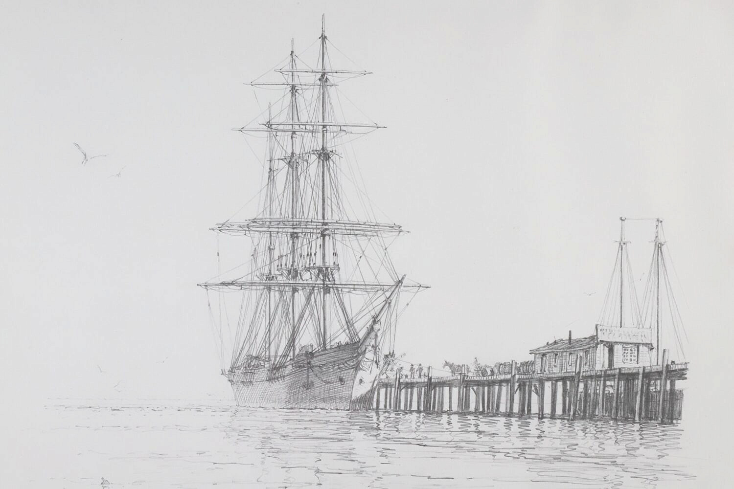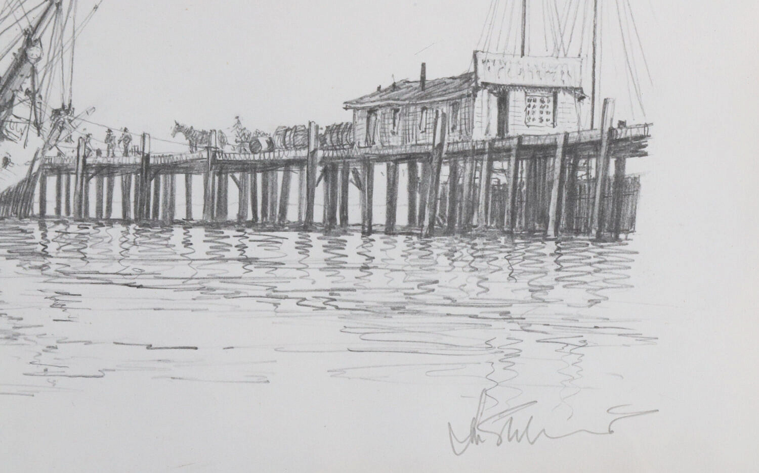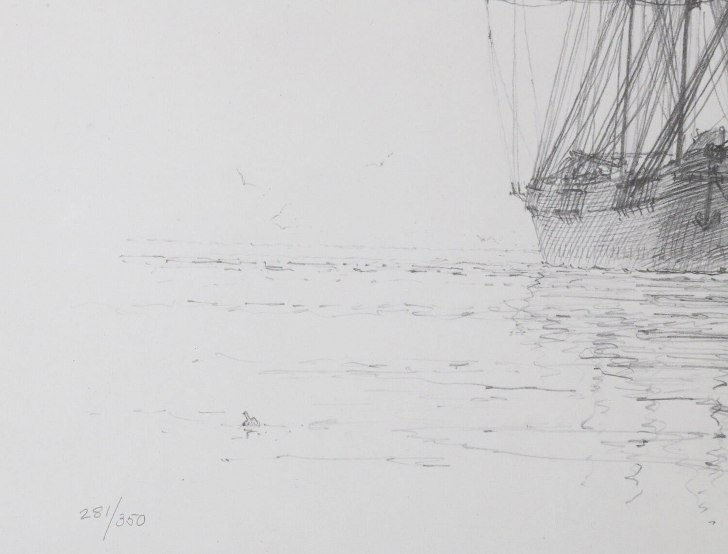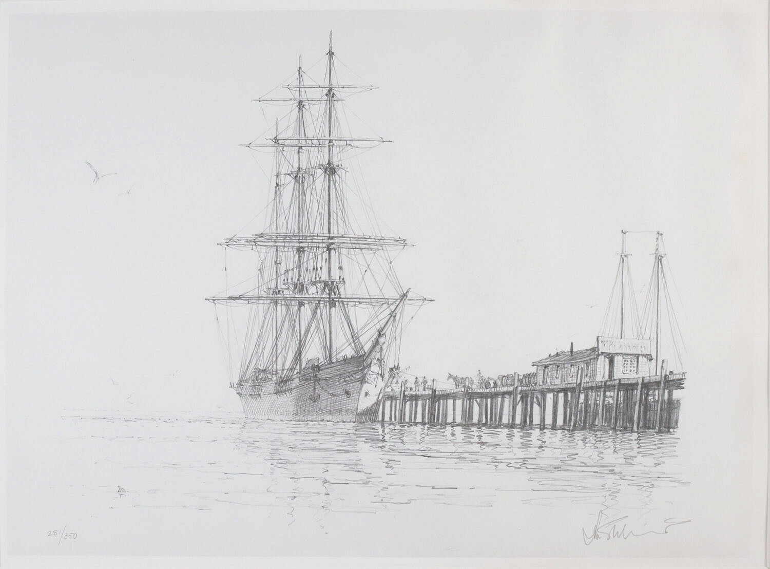 John Stobart (British 1929-2023) Limited Signed Print of Docked Ship at Pier, Ed 281/350, pencil signed lower right, matted and framed