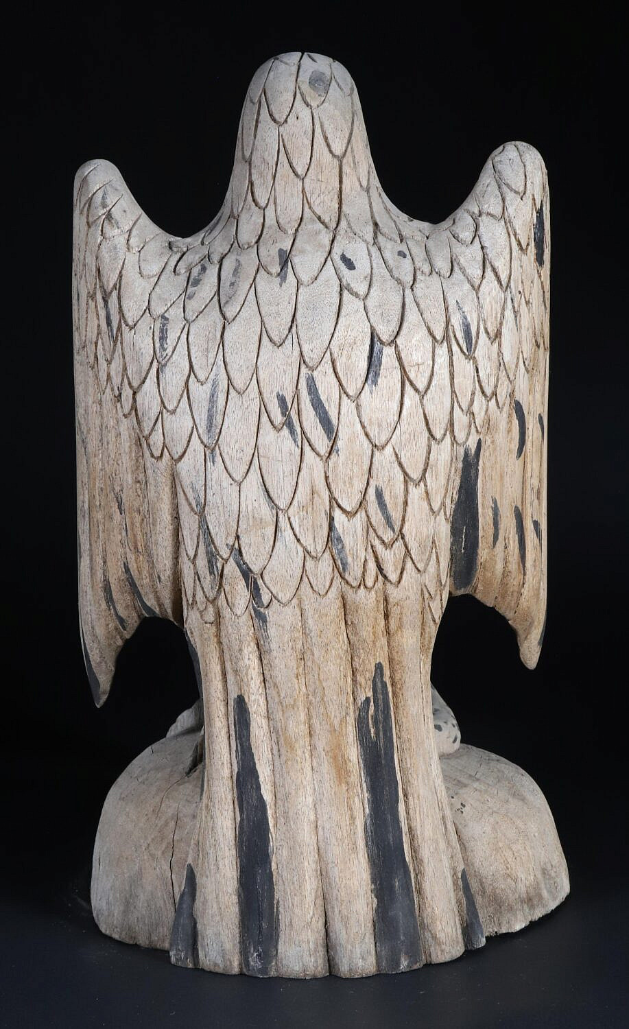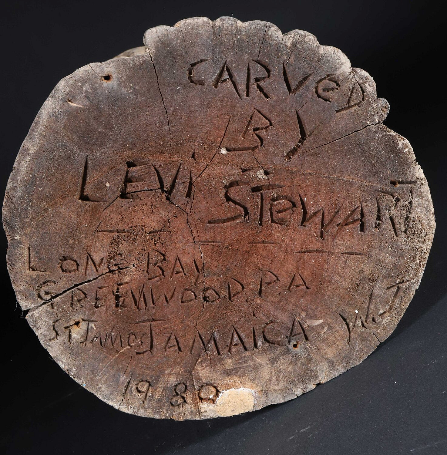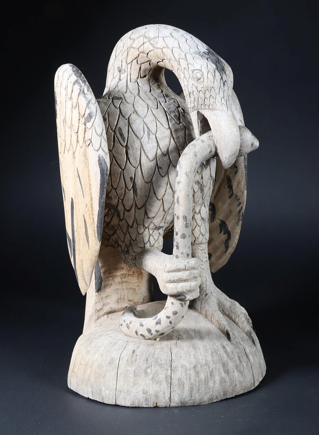 Levi Stewart Carved Eagle with Snake, circa 1980, standing eagle in full control of a snake; black painted highlights; the base is carved with the inscription: Carved by Levi Stewart, Long Bay Greenwood PA St. James Jamaica W.I. 1980