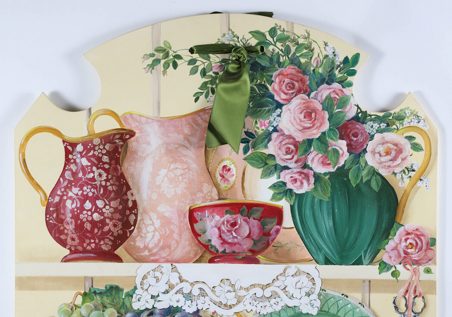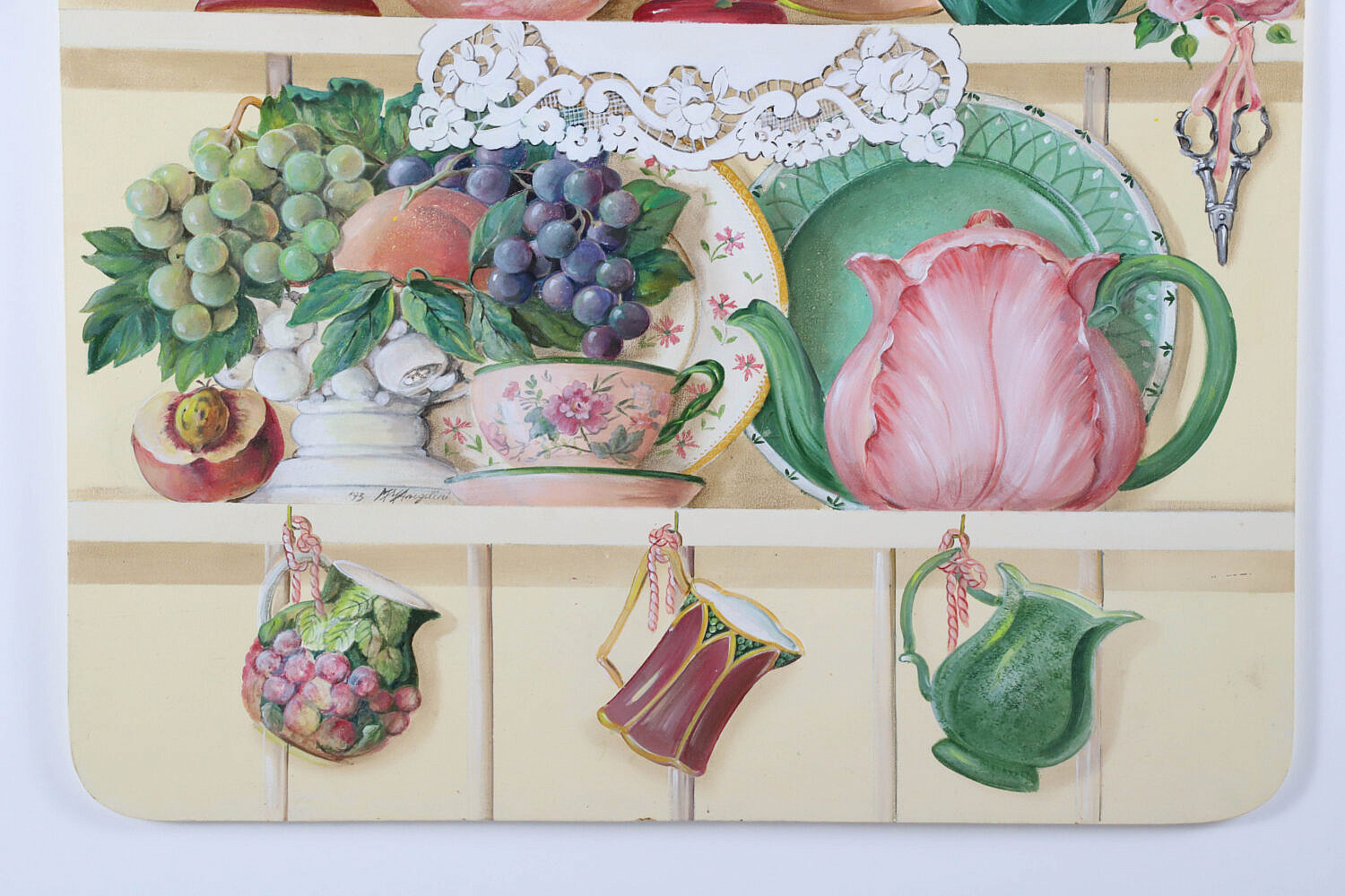 M.V. Angelicci Trompe l’oeil on Panel “Kitchen Shelf Scene”, depicting porcelain pitchers, bowls, creamers, tea pot, grapes, roses and lace, signed mid left M.V. Angelicci