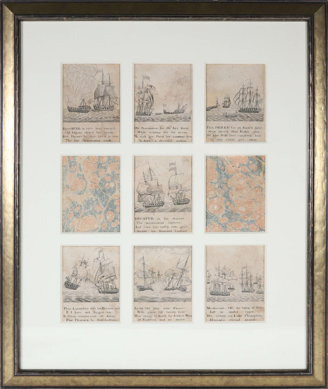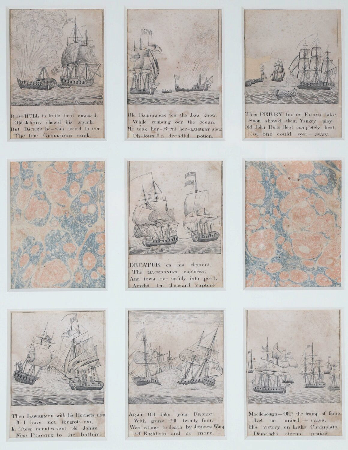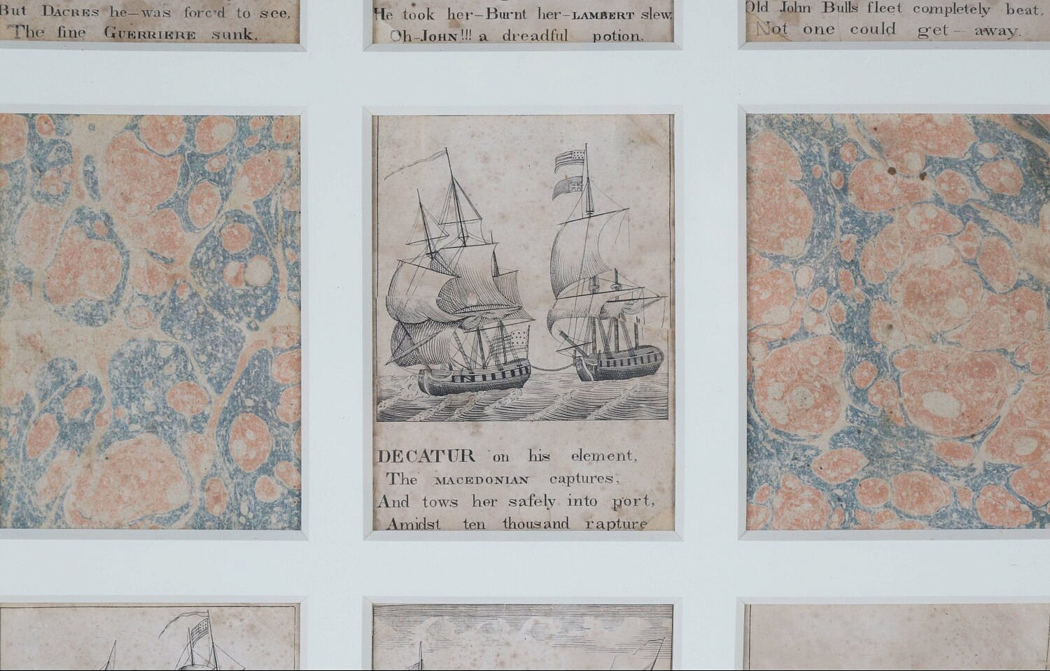 Matted and Framed Ship Vignettes – Seven in Total, marbleized paper in a grid pattern, matted and framed
