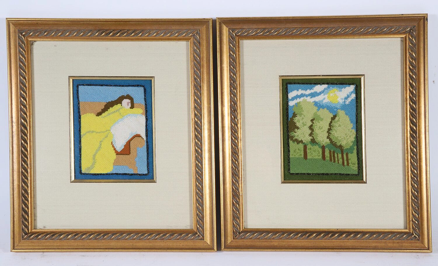 Pair of Framed Needlepoint Pictures “Reclining Woman” and “Forest”, matted in gilt frames