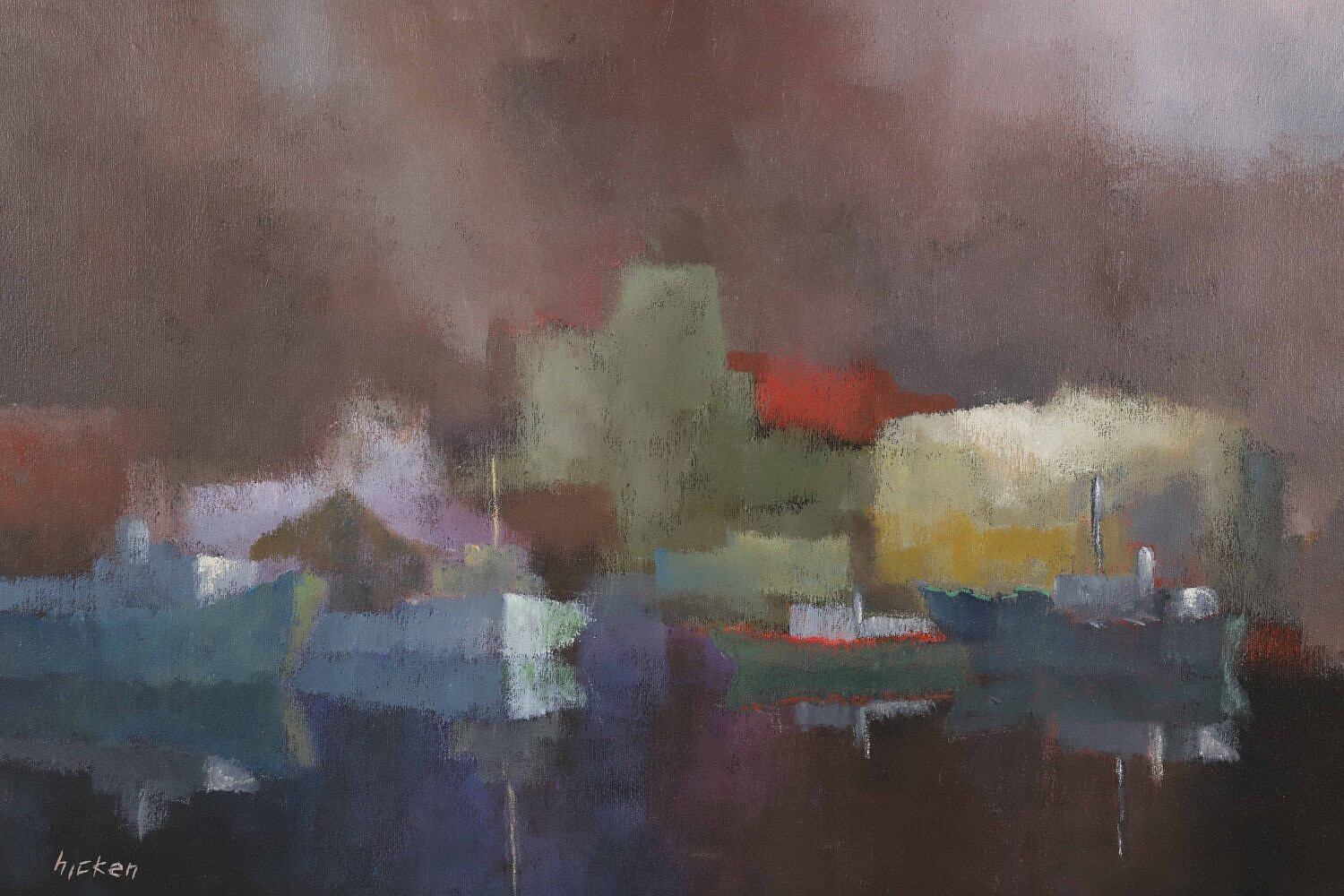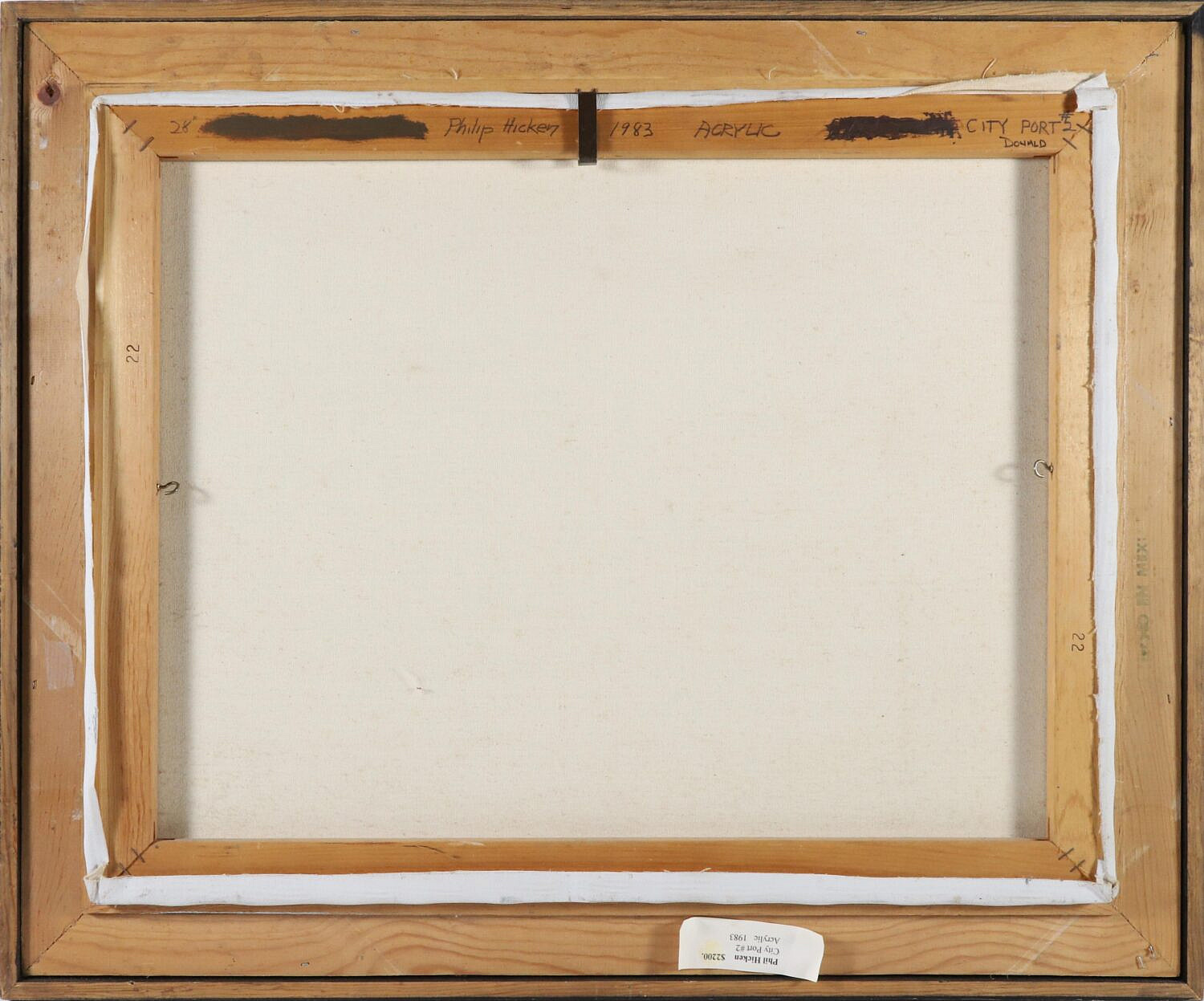 Philip Burnham Hicken (1910-1985) Acrylic On Canvas, “City Port #2, 1983” signed lower left Hicken, matted and framed