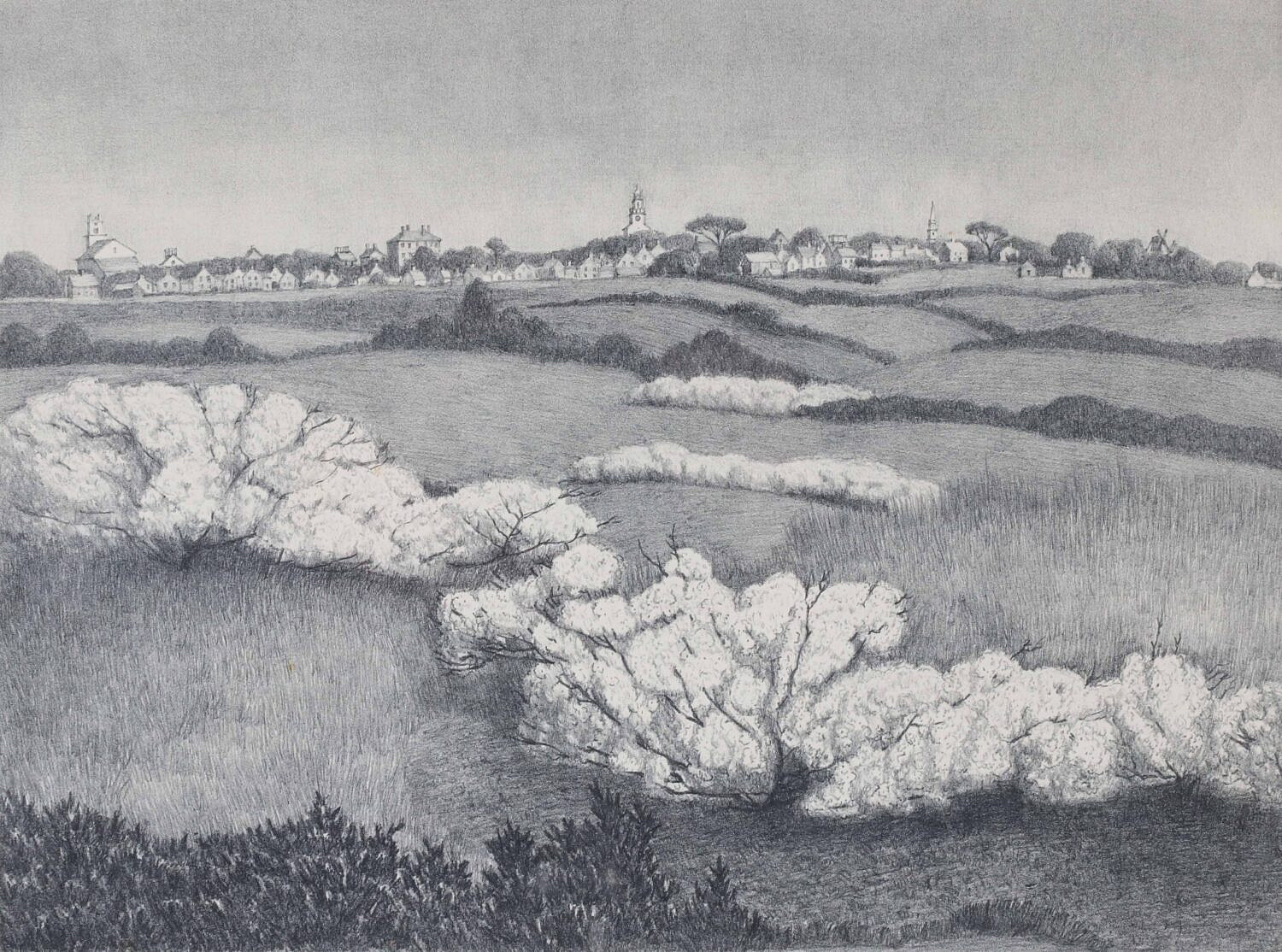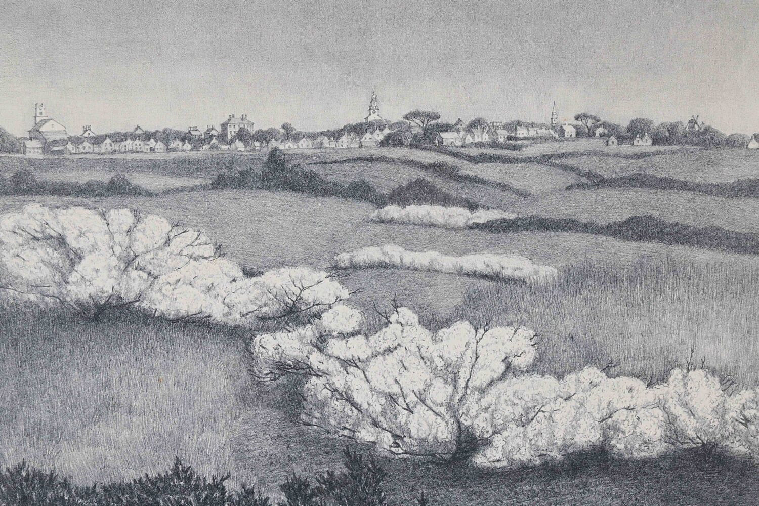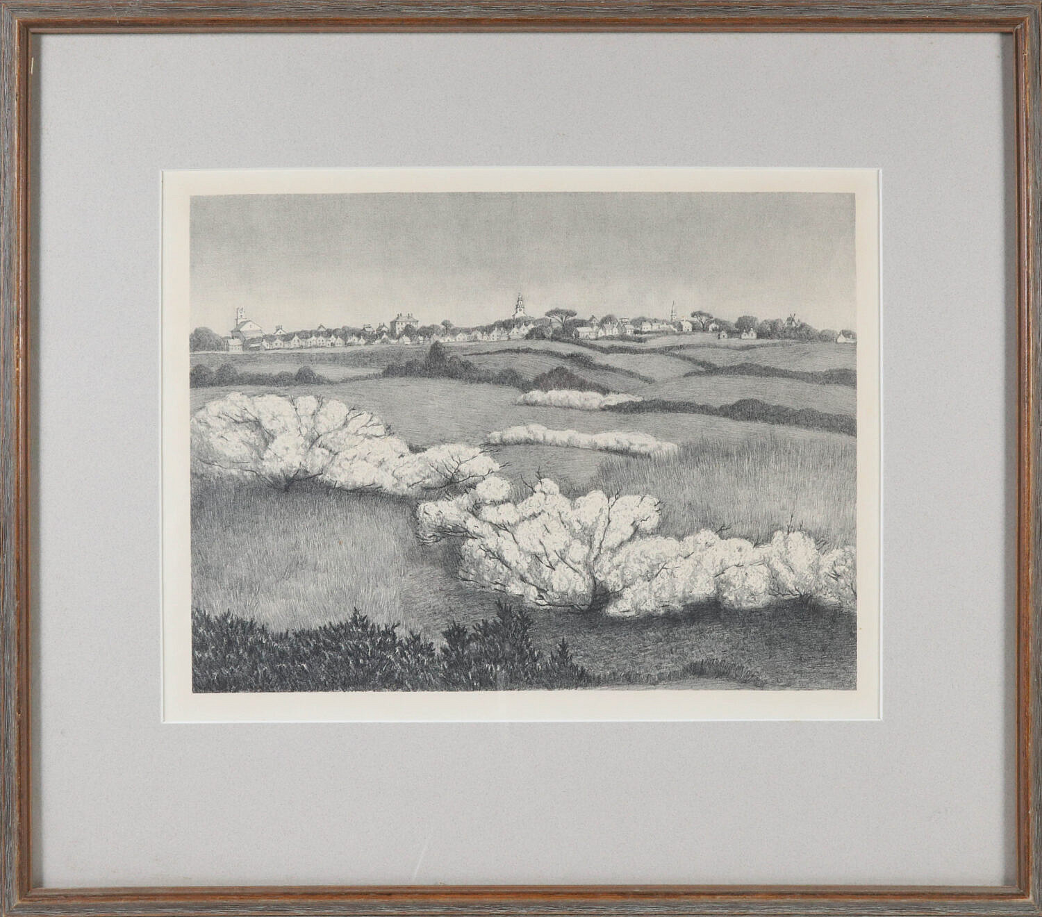 Ruth Haviland Sutton Lithograph “View of the Town of Nantucket from the Moors”, matted and framed