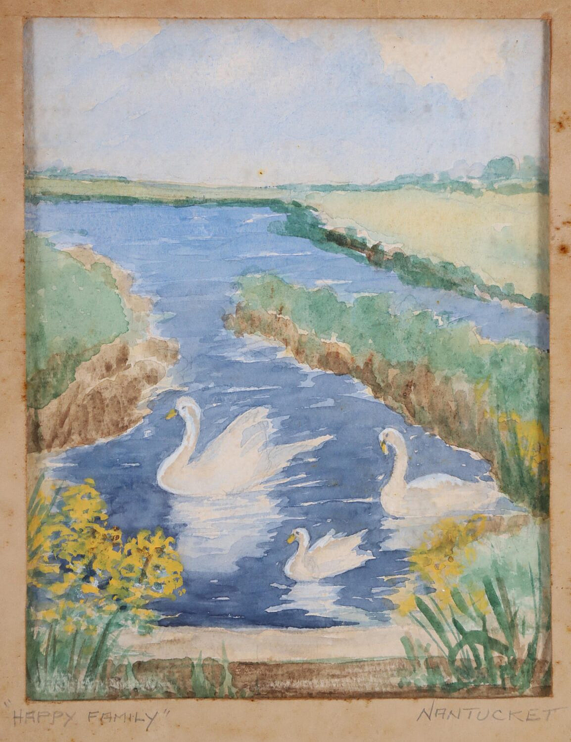 Two Anne Mellin (Massachusetts 20th Century) Watercolors on Paper Titled “Happy Family” and “Old South Wharf”, pencil signed and titled on mats, also signed within the watercolor