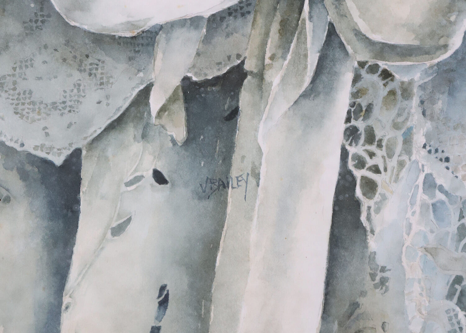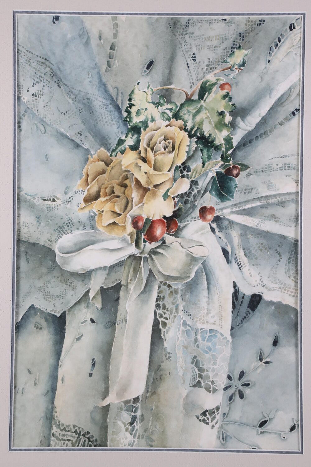 Victoria Bailey Watercolor on Paper “Rose Bouquet and Lace”, signed V. Bailey, matted and framed