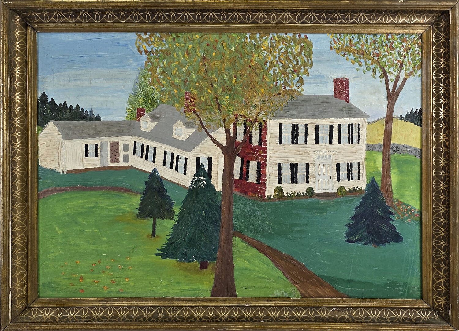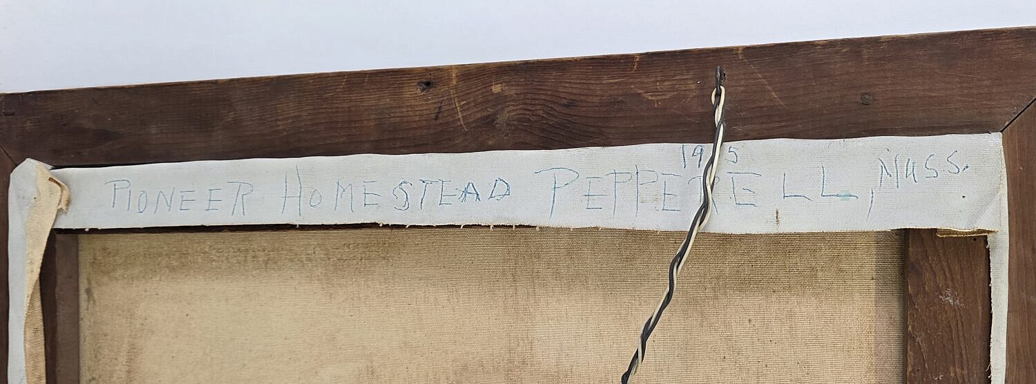 Vintage American Folk Art Oil on Canvas, “Pioneer Homestead”, Painting, circa 1955, Pepperell Massachusetts.