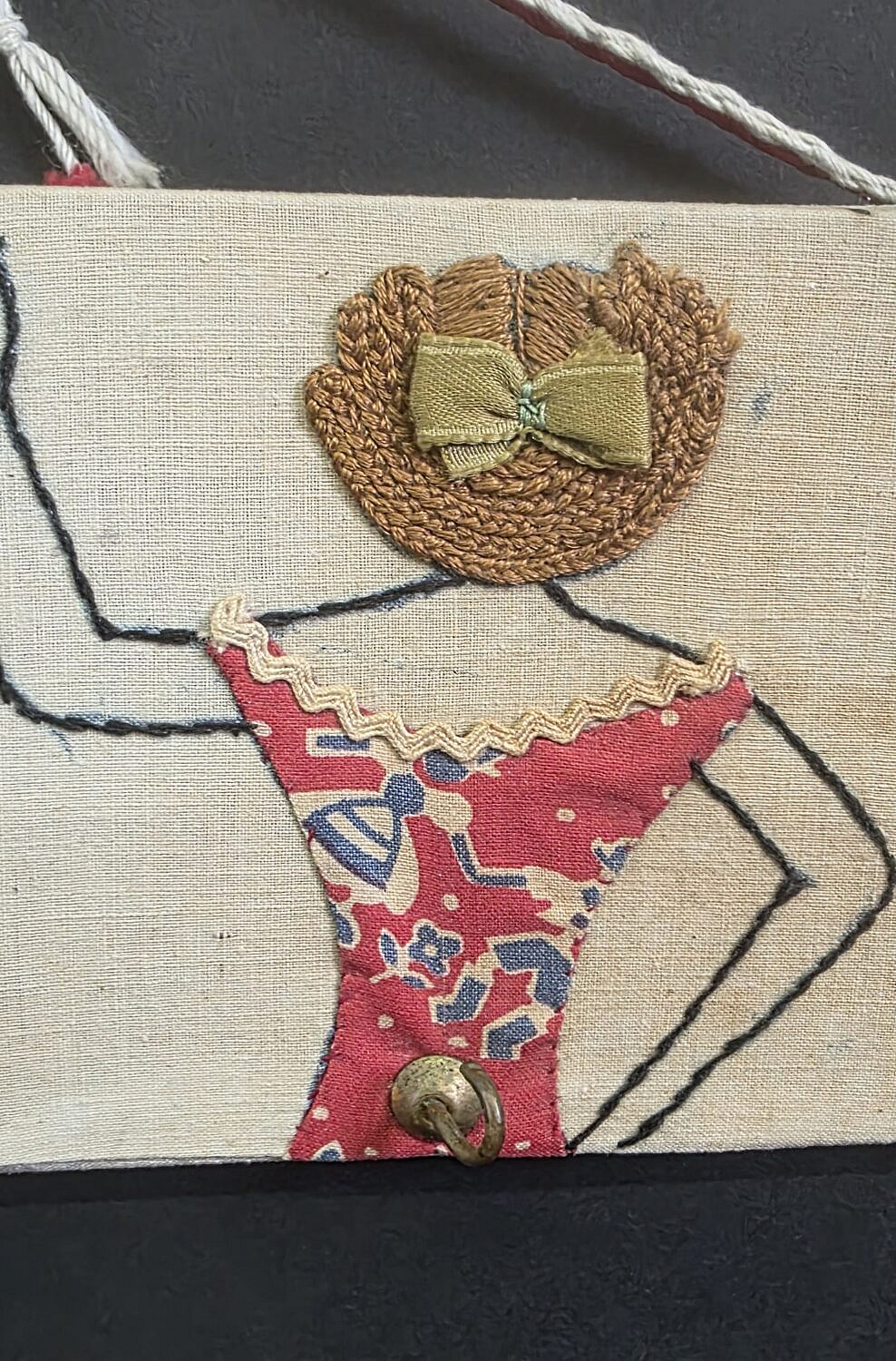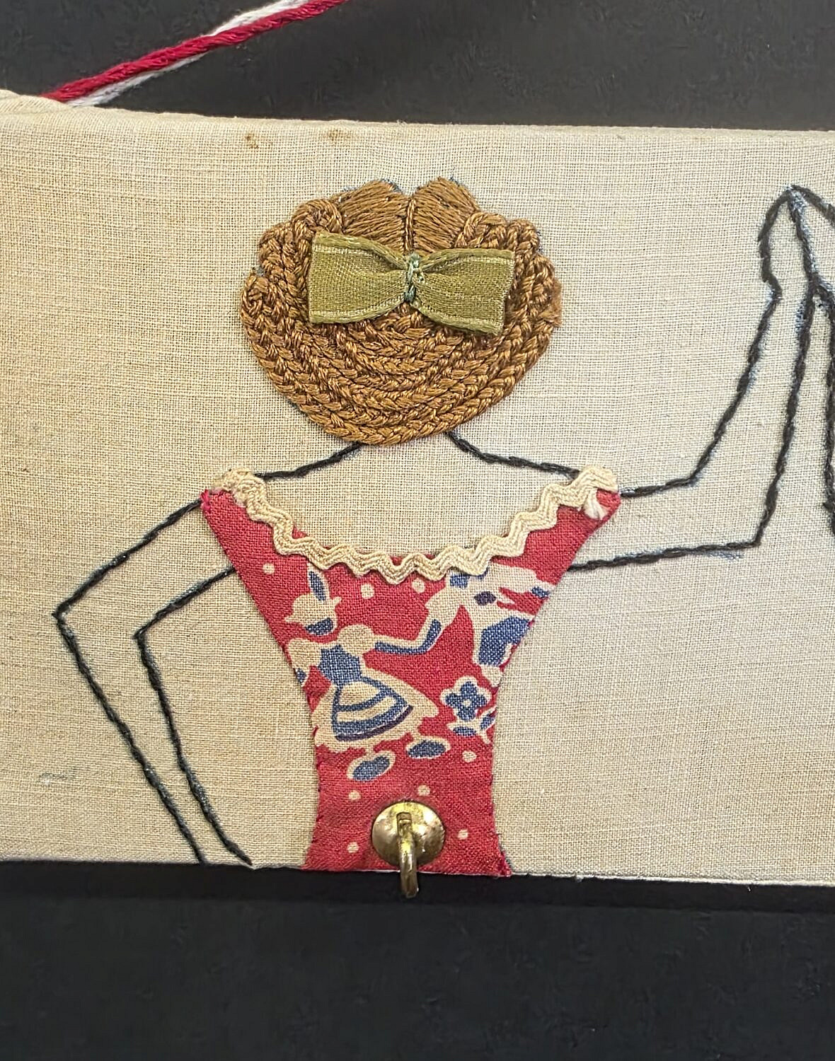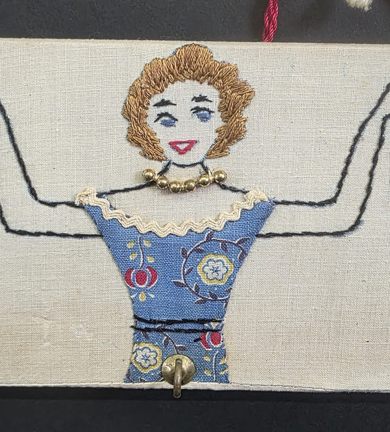Vintage Figural Embroidery Hanging Key Hook, depicting three women with needlepoint hair work and stitched dresses.