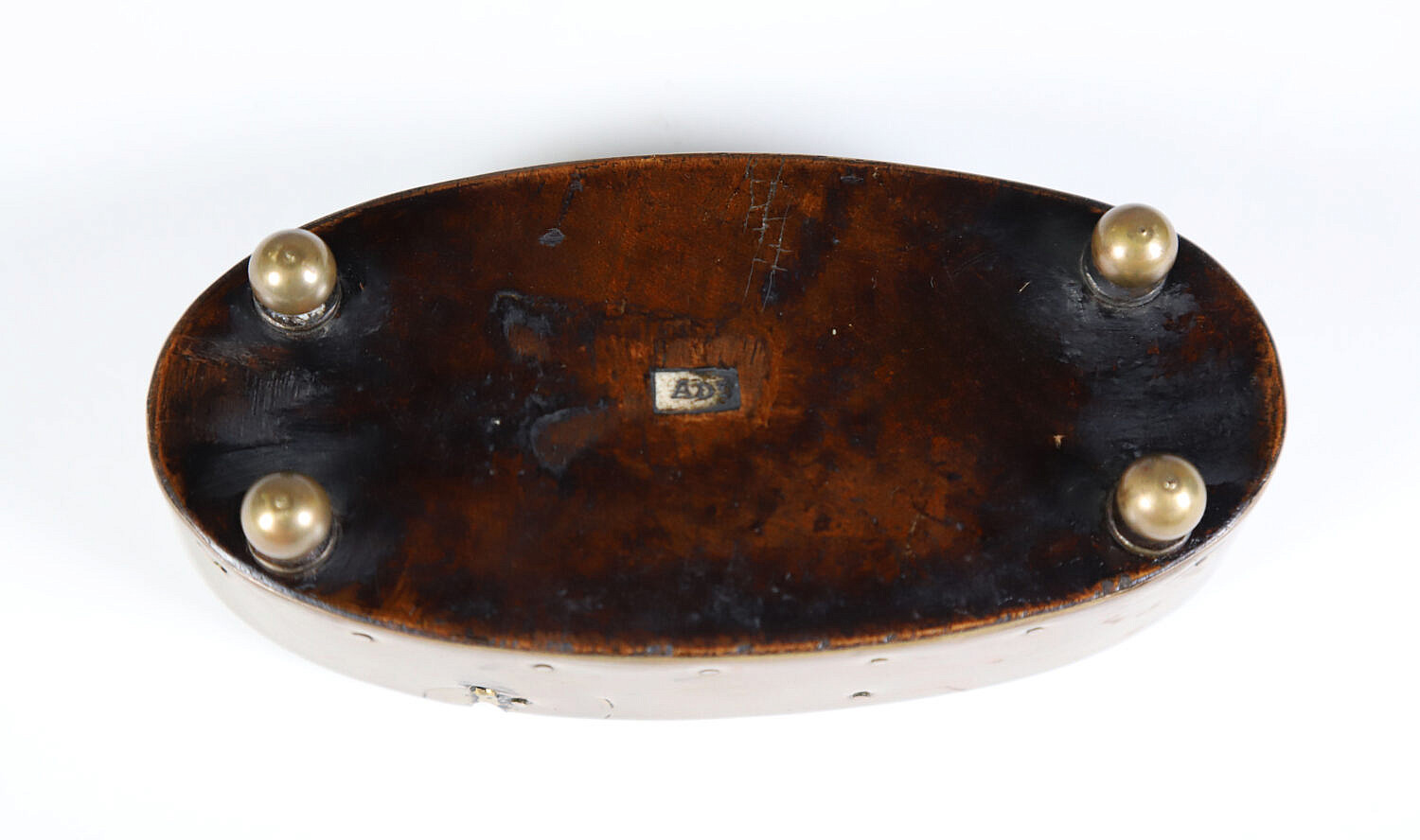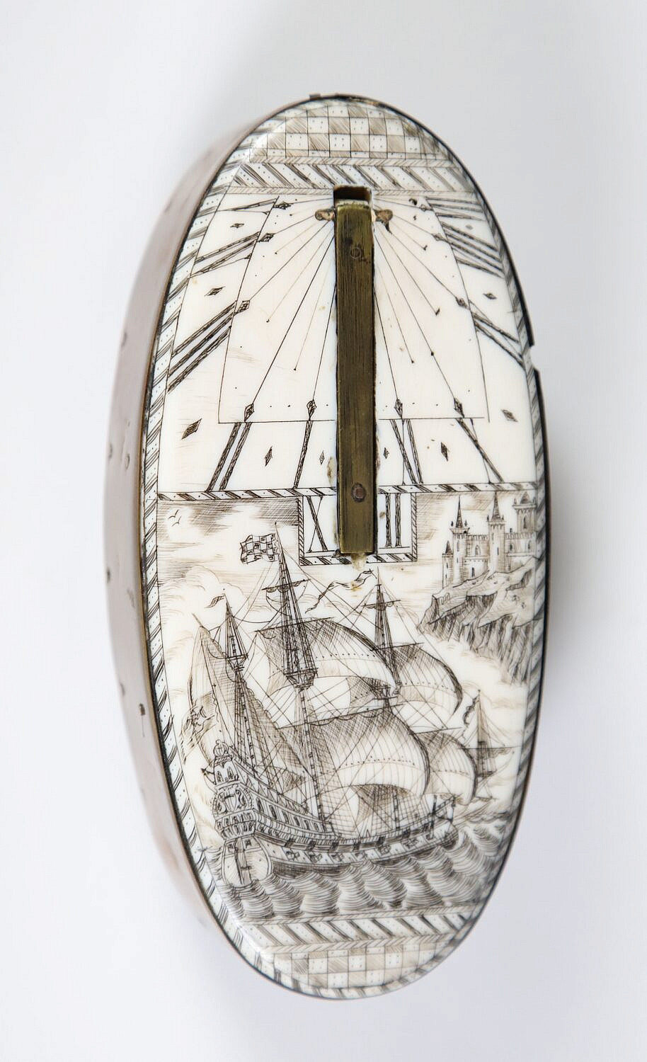 Vintage Miniature Engraved Bone and Brass Oval Sundial with Warship and Castle Decoration