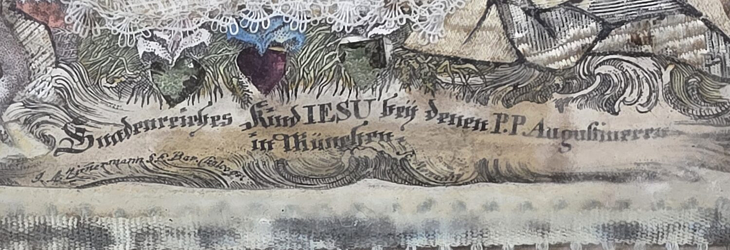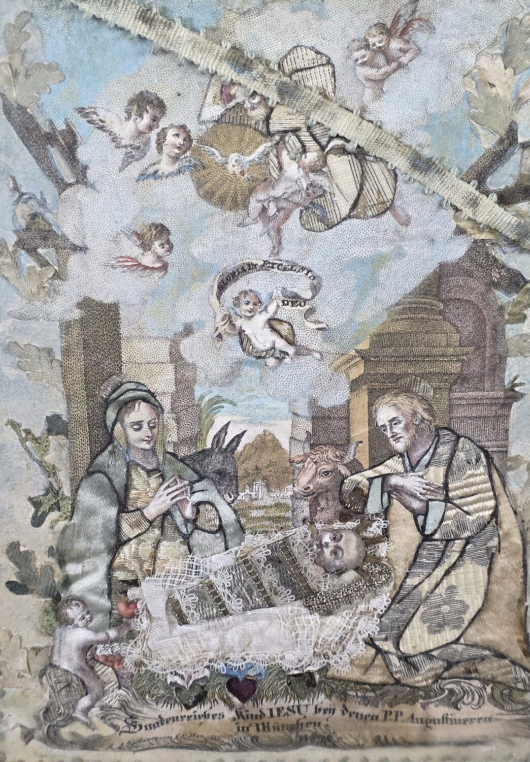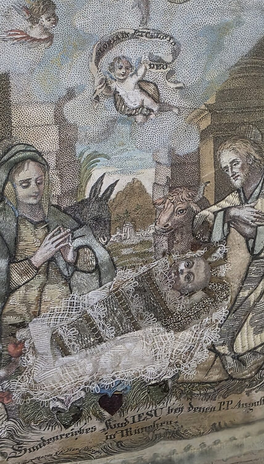 Vintage Mixed Media Baby Jesus Religious Collage, in gilt frame.
