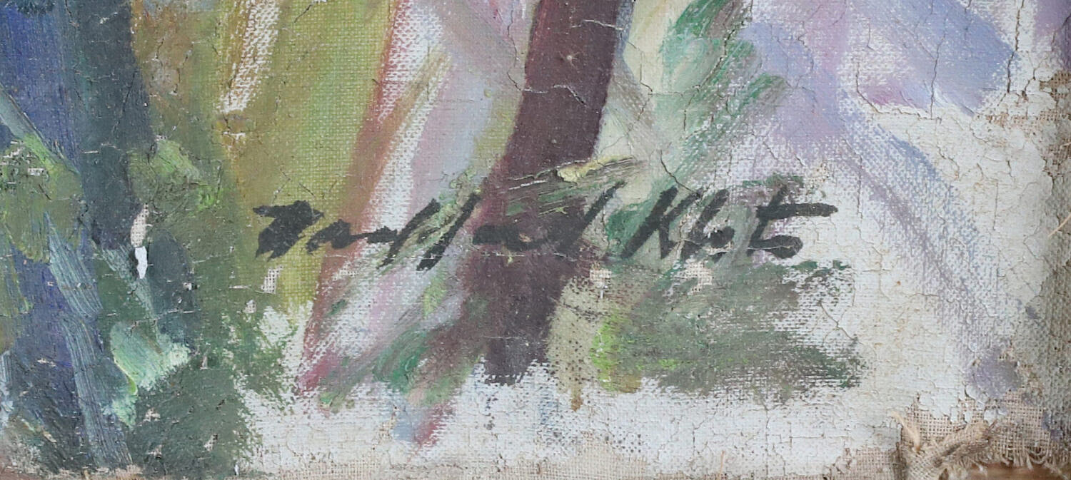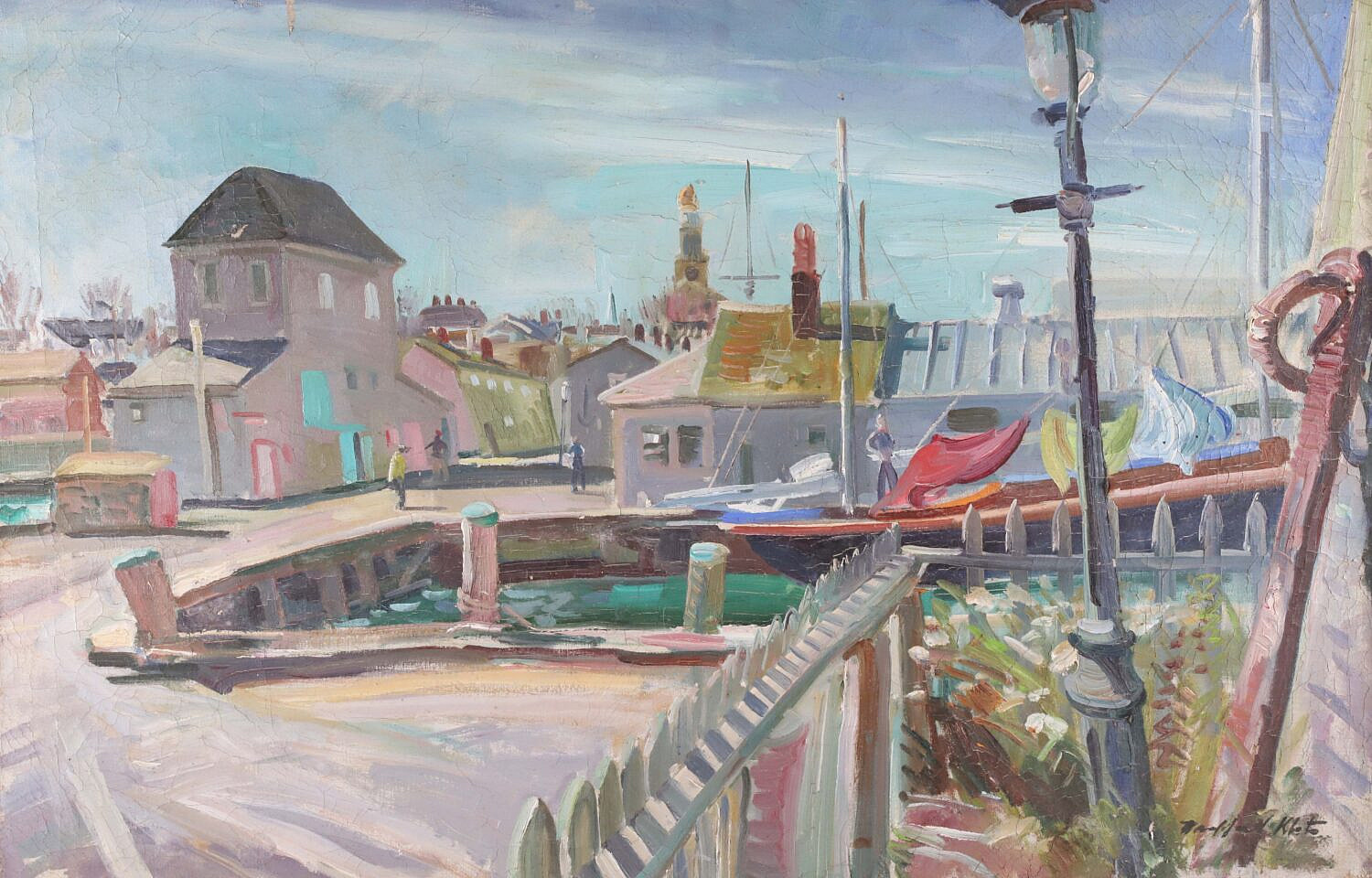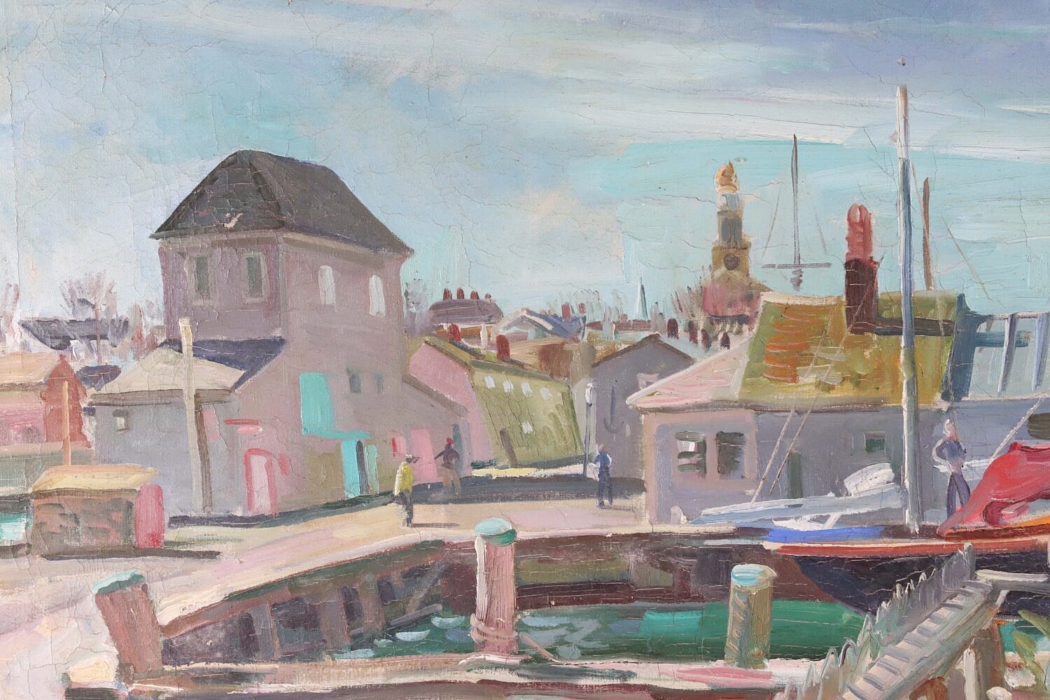 Vintage Naive Oil on Canvas “New England Pier”, Painting, signed indistintcly lower right Bradford Klots (?), in driftwood type frame with rope liner
