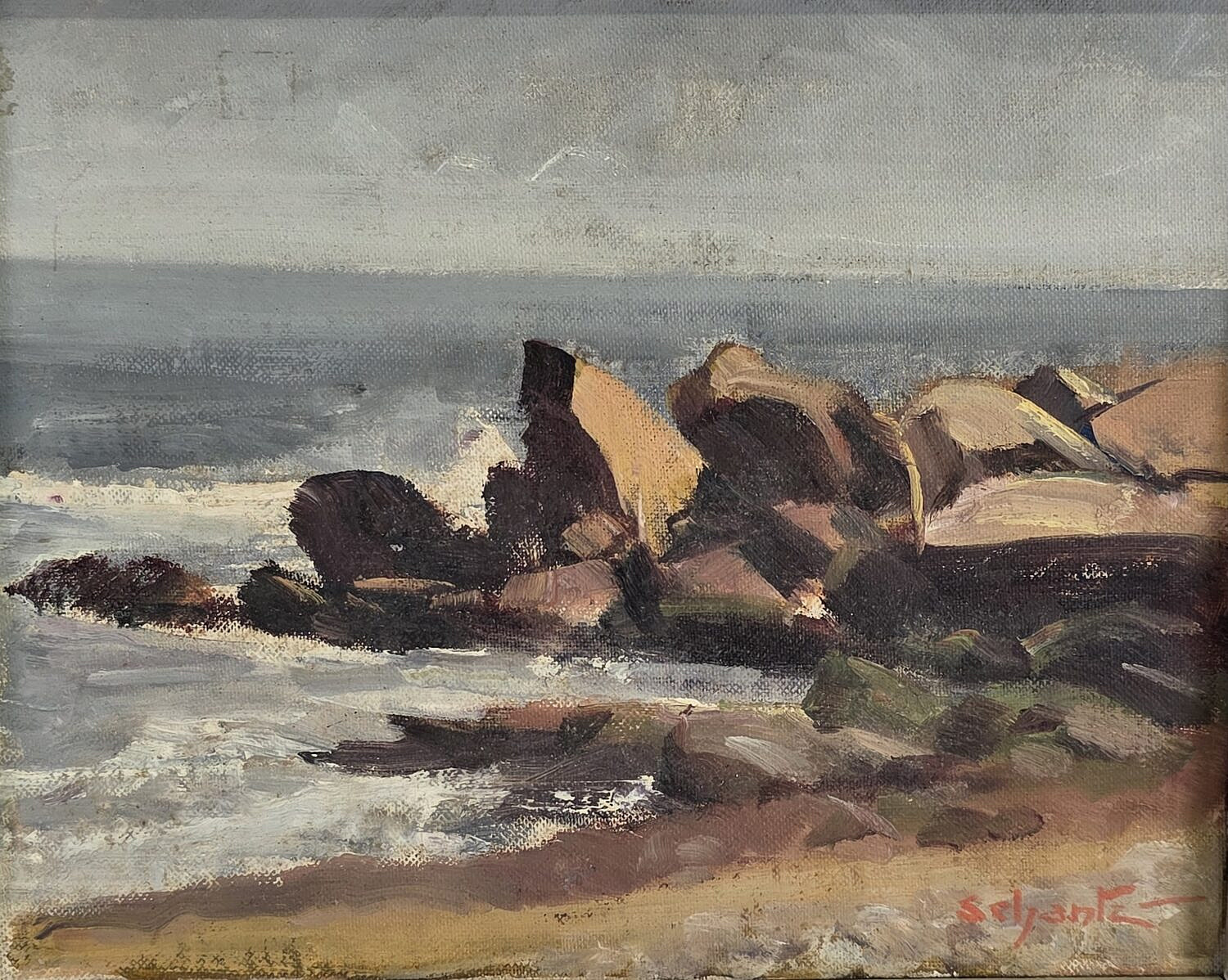 Vintage Oil on Artist Board Cliffside Seascape Painting, 20th century, signed lower right.