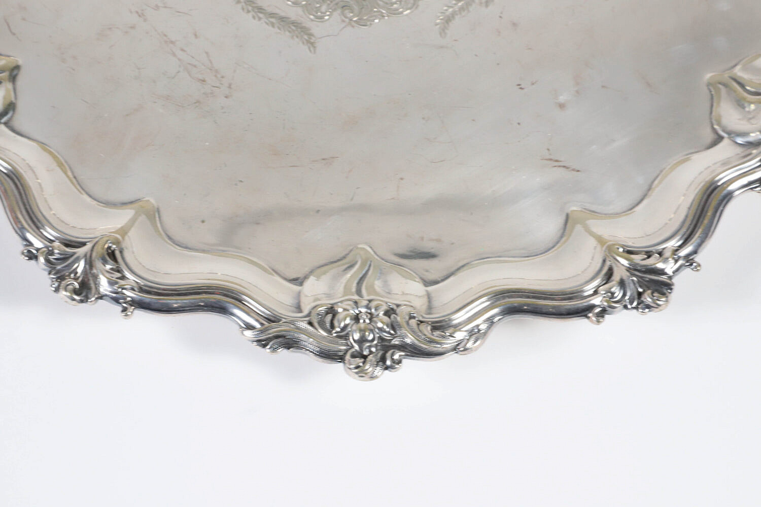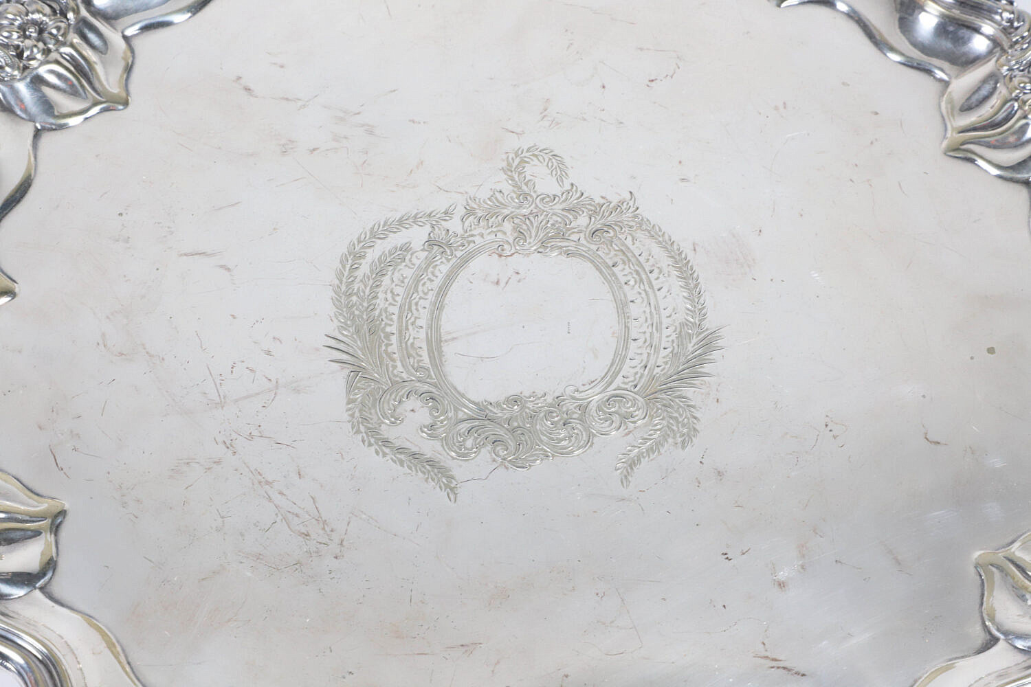 Walker & Hall Sheffield Silver Plated Salver Signed “W & H”, shaped border with flower buds and engraved center on three applied feet.