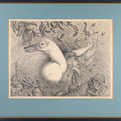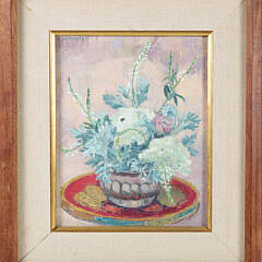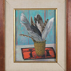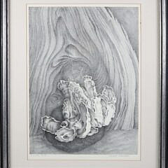 On Nantucket, Saltonstall drew inspiration for her exquisite lithographs from the island’s rich variety of flora, including rose of Sharon, passion flowers, Korean dogwood, and gloxinias. Other favorite subject matter included shells, mushrooms, ducks, and vignettes culled from her close observation of her natural surroundings. Her oil paintings typically feature waterfront scenes, often undertaken from the front deck of her cottage or from a nearby wharf.