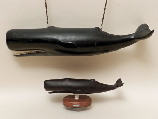 Charlie F. Sayle Carved Wood Sperm Whale and Carved Ebony Sperm Whale