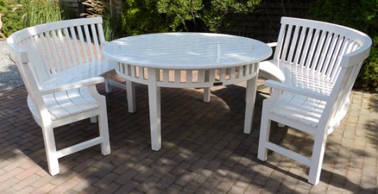 Pair of Weatherend White Lacquer Painted Half Round Benches and Round Dining Table
