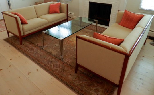 Two Maurice Villency Contemporary Cherry Framed Upholstered Two Cushion Sofas and Modern Chrome and Glass Rectangular Coffee Table
