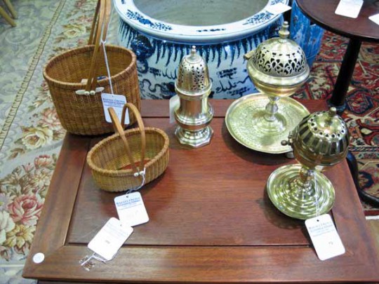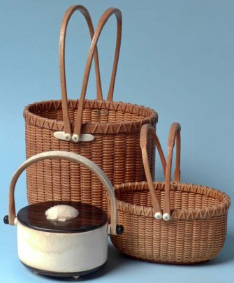 Paul Willer Tall Oval Double Swing Handle Nantucket Basket, Paul Willer Petite Oval Double Swing Handle Nantucket Basket, Paul Johnson Miniature Bone Ditty Box
