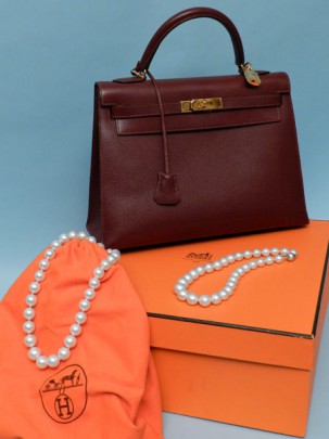 Hermes Bordeaux Kelly Bag, Two White South Sea Graduated Pearl Necklaces