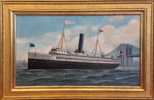Antonio Jacobsen Oil “Steam Sail Ship Horatio Hall Off the Brooklyn Bridge”