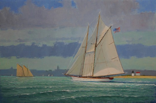 William W. Lowe Oil on Linen “Yacht and Gaff Rigged Sloop Passing Brant Point Light”