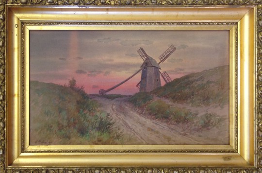 J. D. Hunting Watercolor on Paper “Old Mill, Nantucket at Sunset”