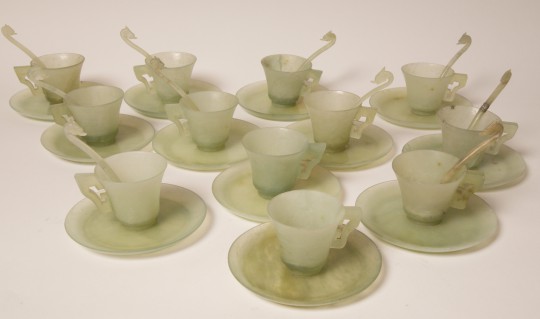 Set of 12 Antique Chinese Jade Cups and Saucers and Spoons