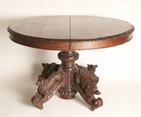 Unusual Black Forest Hunt Themed Carved Oak Extension Dining Table
