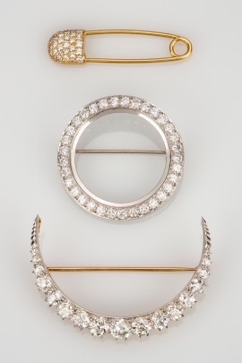 Diamond Safety Pin, Circle Brooch & Diamond Set Crescent Brooch