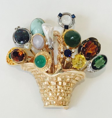 14k Yellow Gold Floral Stick Pins Basket Brooch
