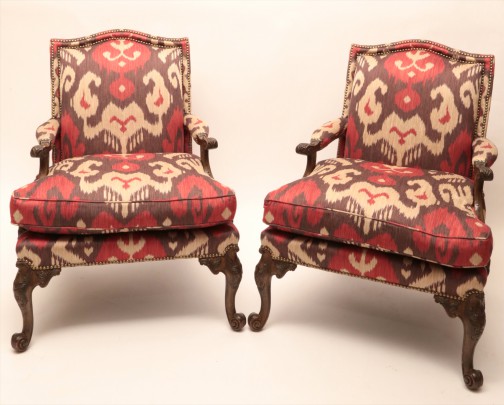 Pair of George II Style Carved Mahogany and Upholstered Library Armchairs