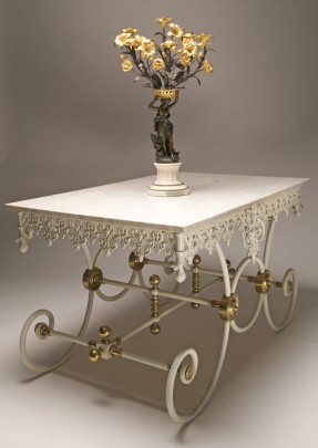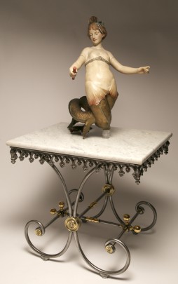 Polychrome Carved Wood Mermaid & French Brass and Iron Marble Top Baker’s Table