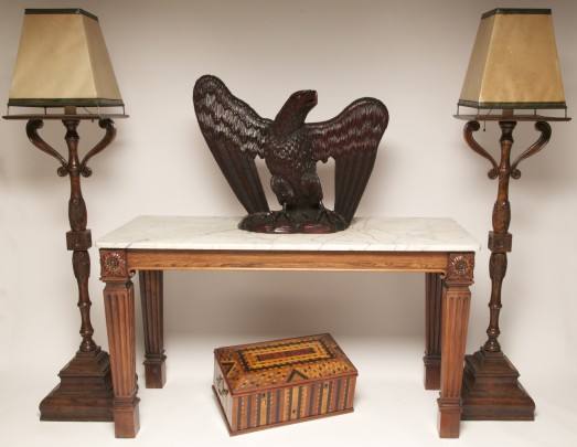 Pair of Torcheres, Eagle Model, Console Table & Parquetry Chest