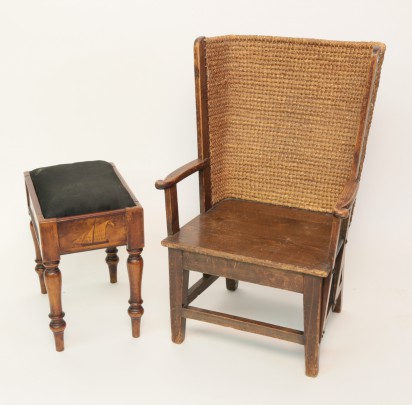 Child’s Orkney Islands Chair and Inlaid Mahogany, Rosewood and Cherry Stool