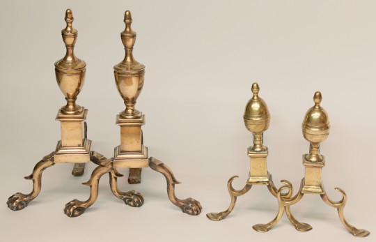 Pair of Federal Bell Metal Andirons and Pair of Brass Philadelphia Acorn and Finial Andirons