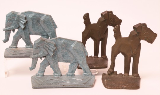 Pair of Art Deco Elephant Doorstops and Pair of Art Deco Terrier Bookends