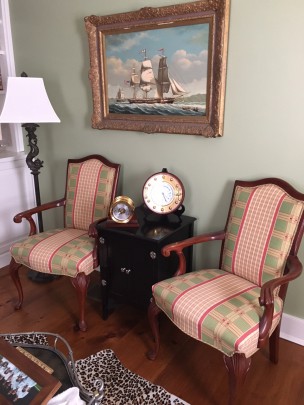 Pair of Plaid Upholstered Open Armchairs & Brass and Teak Ship’s Window Clock