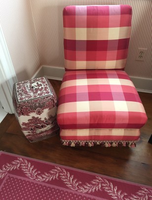 Rose Silk Upholstered Slipper Chair, Chinoiserie Pattern Garden Stool and Wilton Carpet