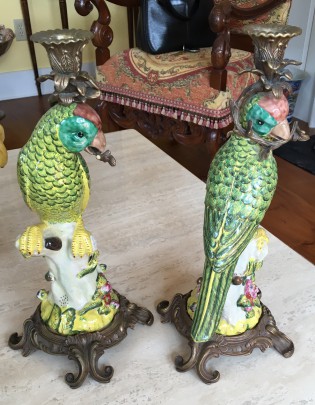 Pair of Ceramic and Patina Metal Parakeet Candlesticks