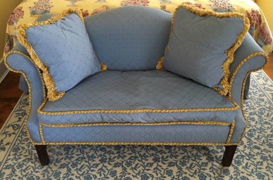 Petite Blue and Gold Silken Upholstered Settee