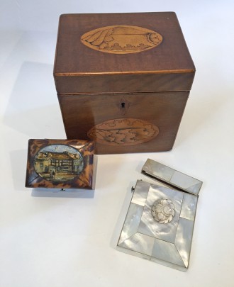 19th Century English Shell Inlaid Square Tea Caddy, Shell Inlaid Box & Mother of Pearl Card Case