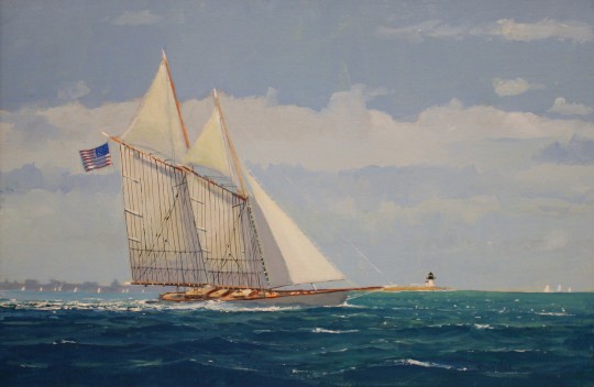William W. Lowe Oil on Linen “Hard Driving Schooner Departing Nantucket”