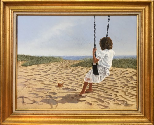 Tom Mielko Acrylic on Masonite “Girl on a Swing With a Lightship Basket”
