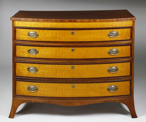 Fine Early 19th Century Tiger Maple and Mahogany Bow Front Chest