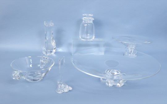 14 Signed Steuben Clear Glass Salad Plates & Fish Form Bud Vase